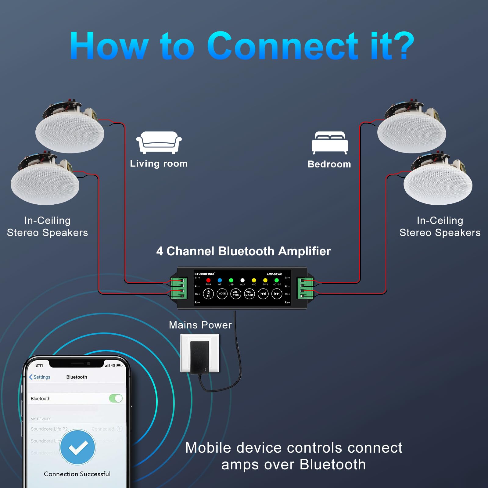 - High-Performance Bluetooth 4-Channel Amplifier:(MIC/AUX/USB/BT Functions) Upgrade your audio setup with STUDIOFINIX amplifier. Its Bluetooth 5.0 offers fast, high-quality transmission over a long range, Connect four speakers at once for full-room sound.