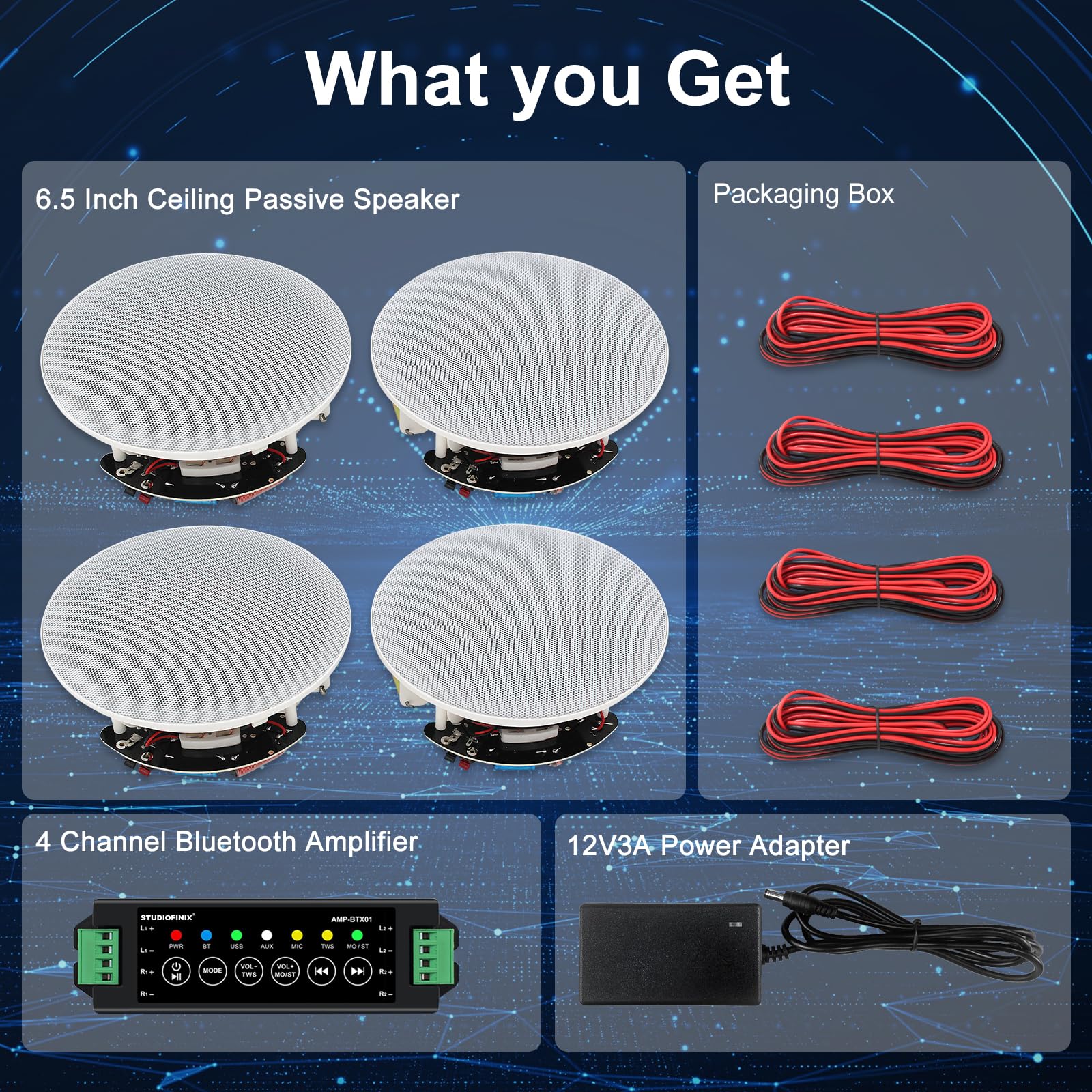 - WHAT'S IN THE BOX:4 x 6.5' Ceiling Speakers,4 x Speaker Wires,1 x 4 Channel Bluetooth Amplifier Box,1 x Power Adapter