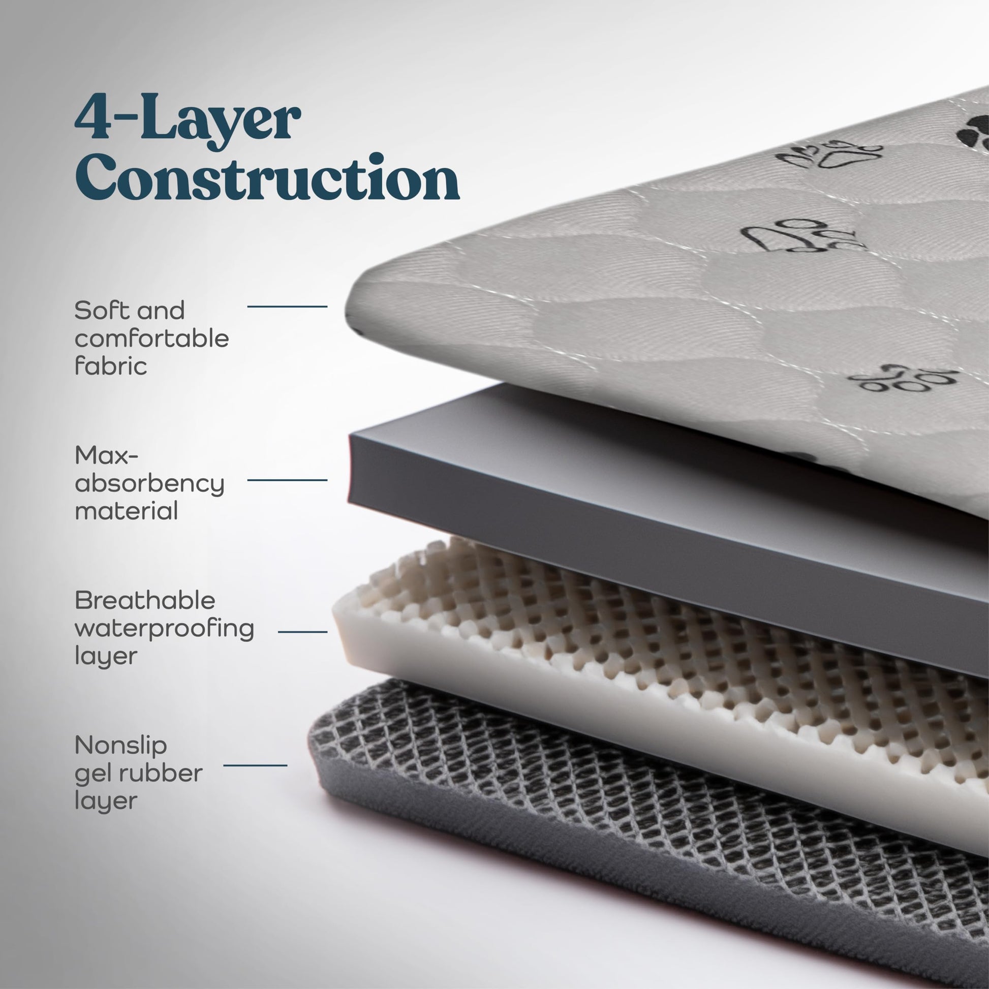 - 4-Layer Construction - The outer layer is supremely comfortable and soft, covering a highly absorbent second layer. The inner layer is of a breathable, waterproof material, and the bottom is a nonslip gel fabric that won’t slide even with a wiggly dog.