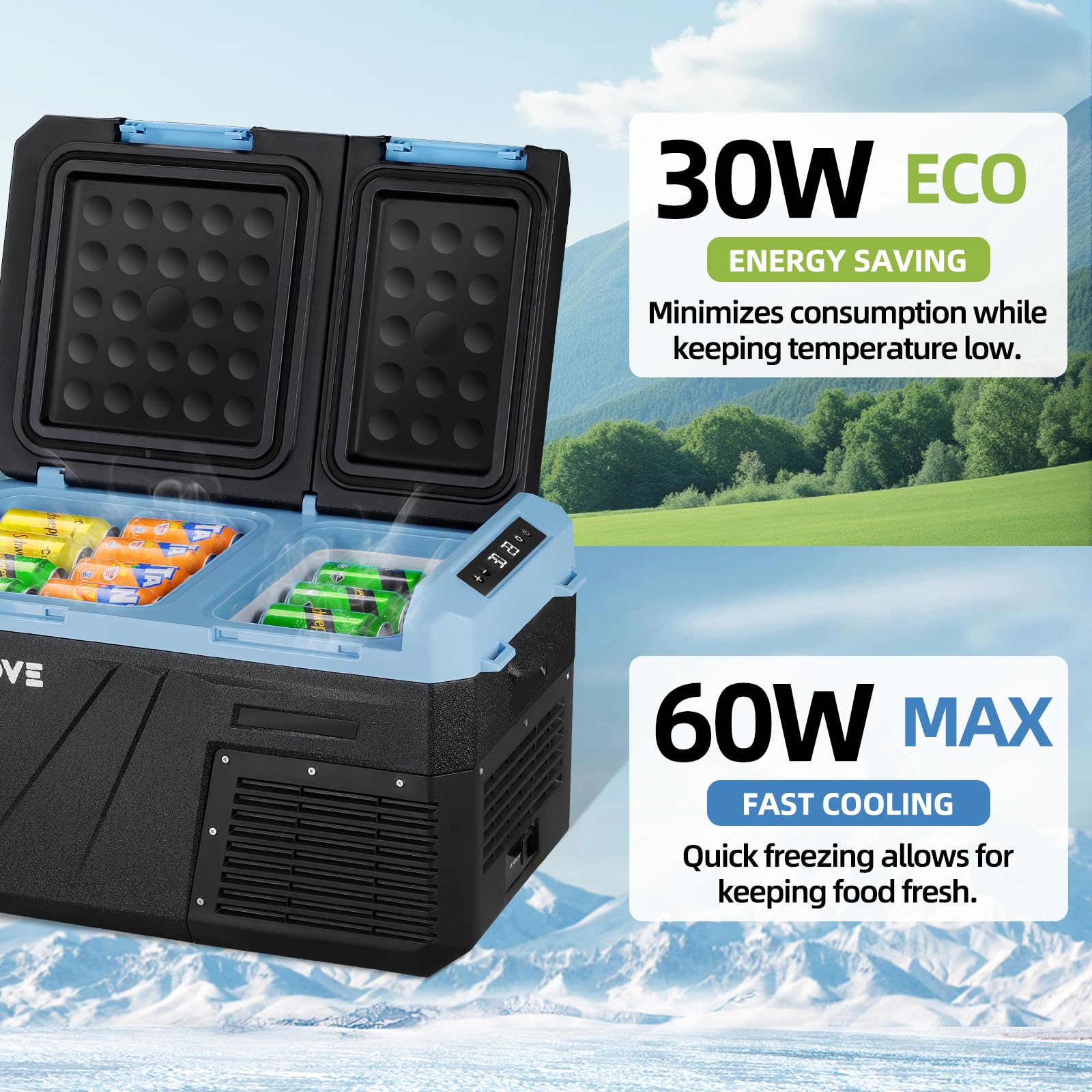 - Smart LED Touch Control and Quiet Operation Digital touchscreen panel allows easy temperature control and Fahrenheit/Celsius switching. Interior soft LED lights turn on automatically when the lid opens. ECO mode uses less than 25W, MAX mode under 1kWh per day. Operates quietly at 45dB. Three-level battery protection (H / M / L) prevents vehicle battery drain, overload, and short circuit. Perfect for semi-trucks, RVs, SUVs, campers, vans, boats, and more.