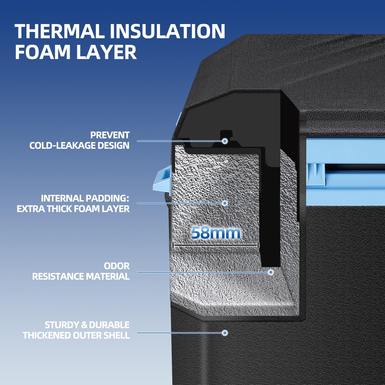 - Ultra-Fast and Efficient Cooling Equipped with a high-performance compressor and advanced 360-degree direct cooling technology. The 45mm thick foam and composite insulation lock in cold air. No ice needed. Drops from 68℉ to 32℉ in 15 minutes and reaches -4℉ in 50 minutes for reliable, long-lasting cooling.