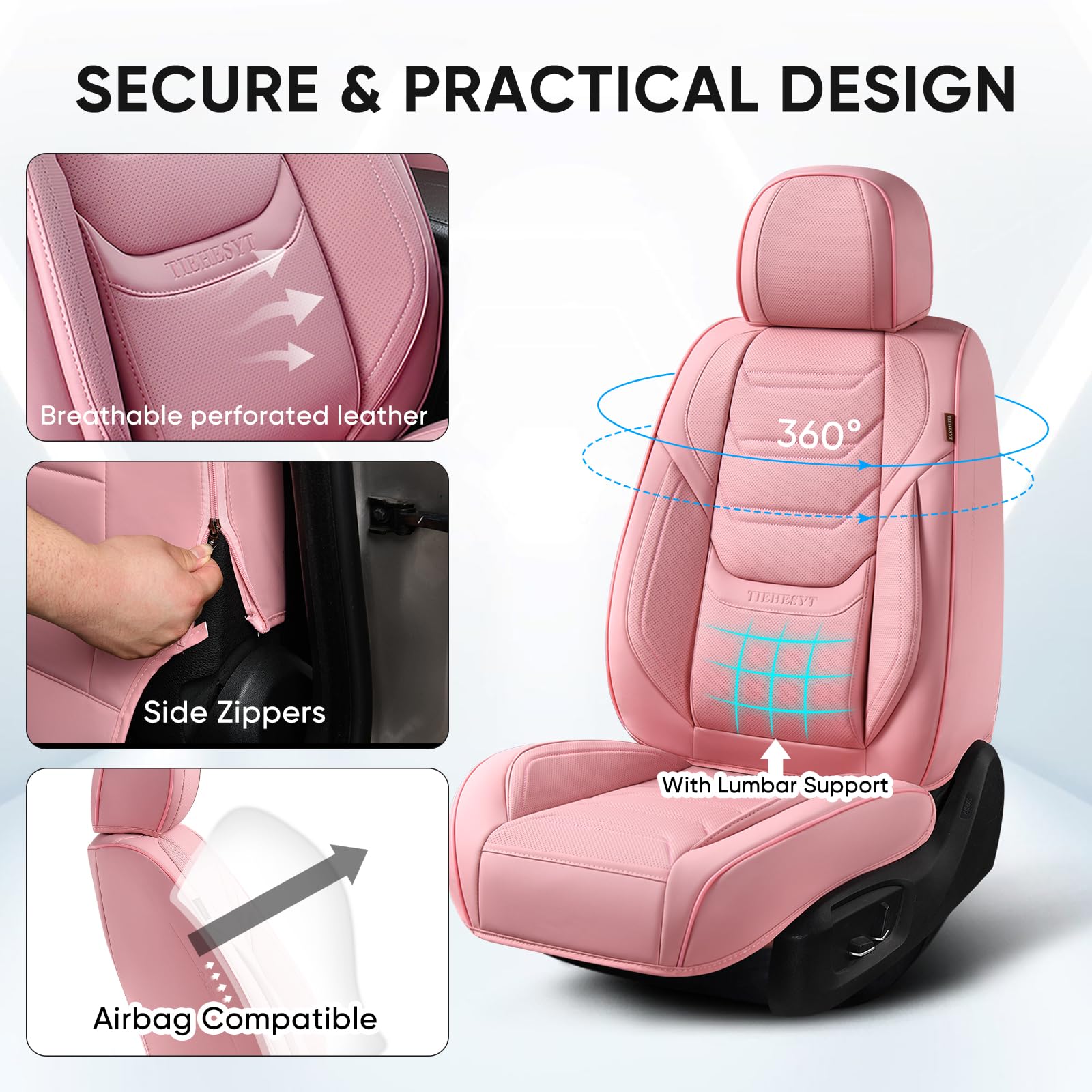 TIEHESYT Pink Car Seat Covers Full Set, Breathable Leather Automotive Front and Rear Seat Covers with Headrest, Waterproof Auto Seat Protectors Fit for Most Sedans SUV Pick-up Truck