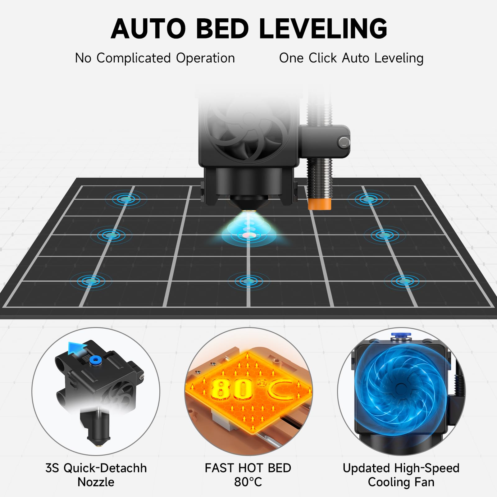 - COMPACT DESIGN:Compact design 3d printer with full features, easy to place, does not take up your space. With 80℃max adjustable heat bed, quick release nozzle, 40S fast heating filament, 10,000rpm high speed fan to help fast cool at high speed printing, ensures rapid cooling down of the models and a fast printing experience.