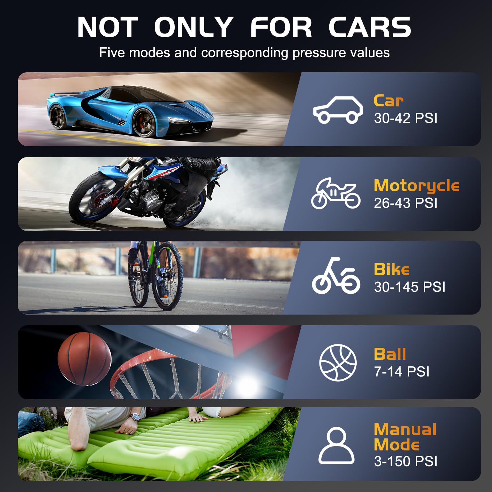 - [Own More, Spend Less] With 5 preset modes for cars, motorcycles, bikes and balls, as well as a custom mode up to 160PSI, the ZUZEE portable car tire inflator is an excellent value. It is compatible with a wide range of vehicles (including SUVs, MPVs and pickups), and comes with 4 valve adapters to meet all your inflation needs. Equipped with a built-in sensor that accurately measures tire pressure in real time, the LED screen ensures you can easily view tire pressure values.