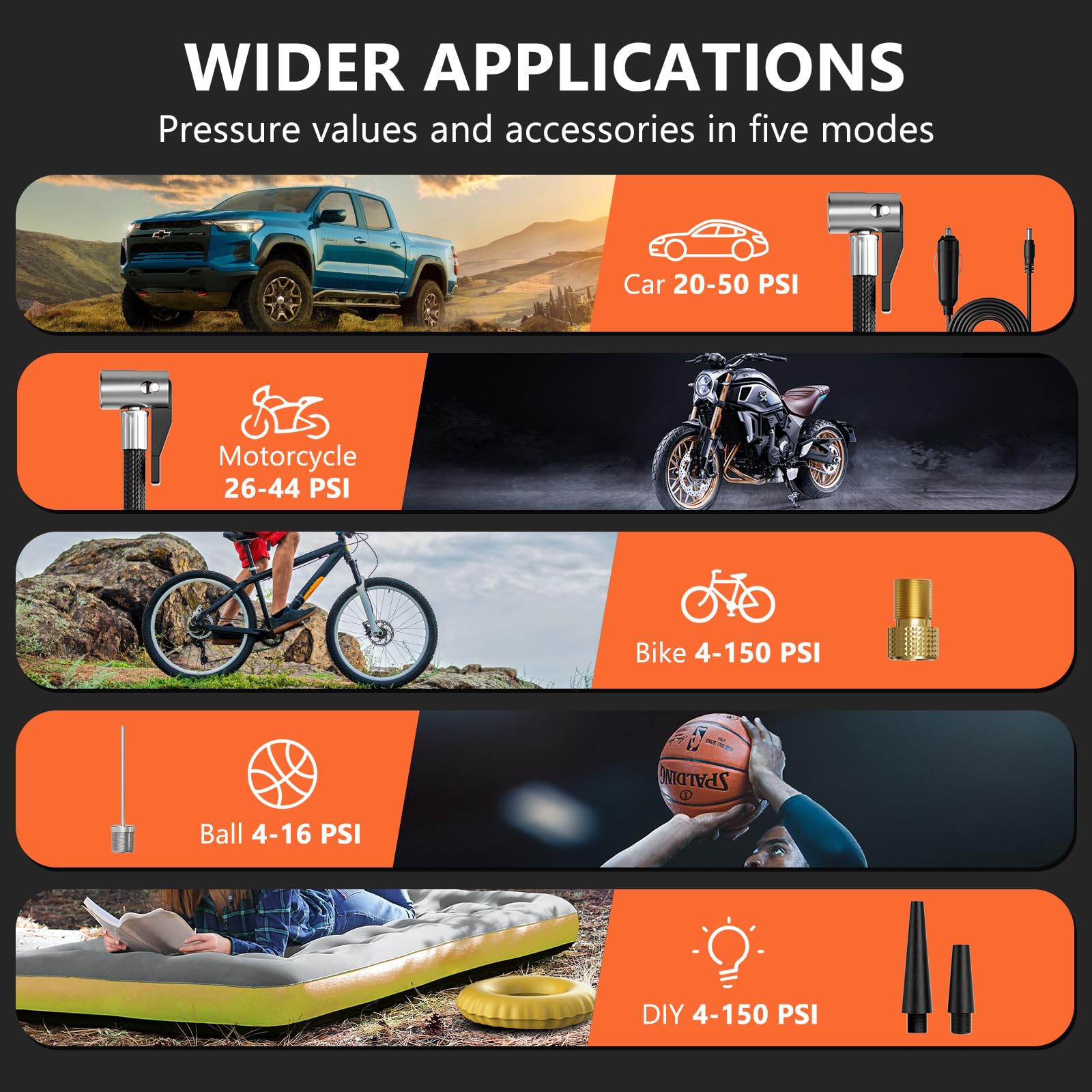 - [More powerful but easier] - 4 preset modes of Z1 portable air compressor make it easier to inflate cars, motos, bikes and balls. And the 0-150PSI Custom mode meets more inflation needs. What's more, 4 pressure units can be switched at will, a digital pressure gauge allows real-time pressure and preset values to be clearly seen everywhere, and the auto-off function when the preset value is reached. Easier operation!