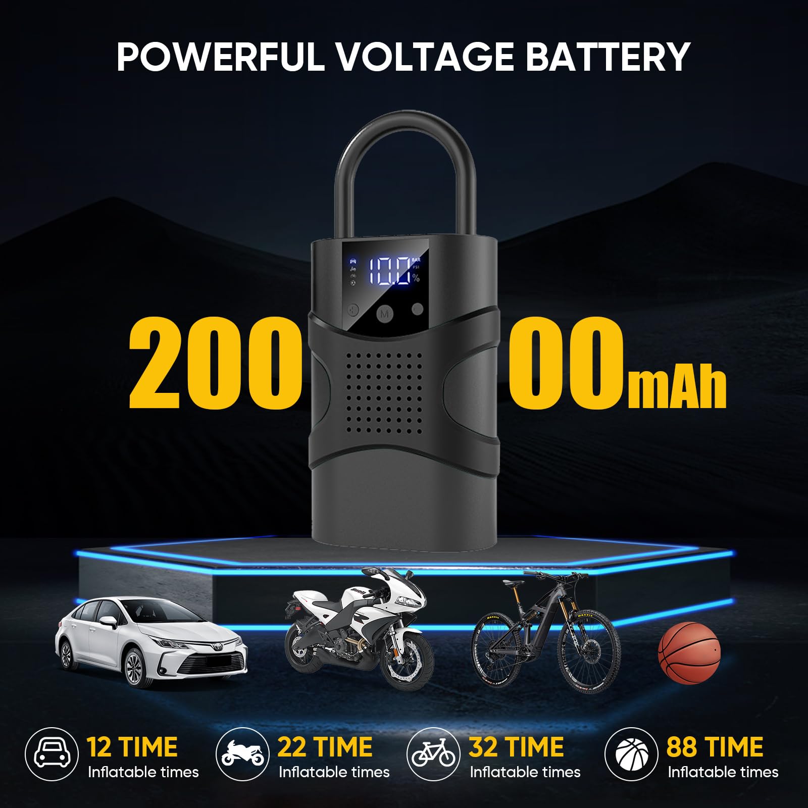 - 【QUICK & ACCURATE】- Built with the highest quality materials, Vehplstrt is a portable tire inflator for car, trucks, SUVs, motorcycles, and bicycles. Portable tire inflator for car is equipped with 20000 mAh rechargeable battery, inflate 6.5X faster than others air pump, extend the service life by 3 times, from 30 PSI to 36 PSI in 40S.Small and compact car air pump that fits in your glove box or trunk.