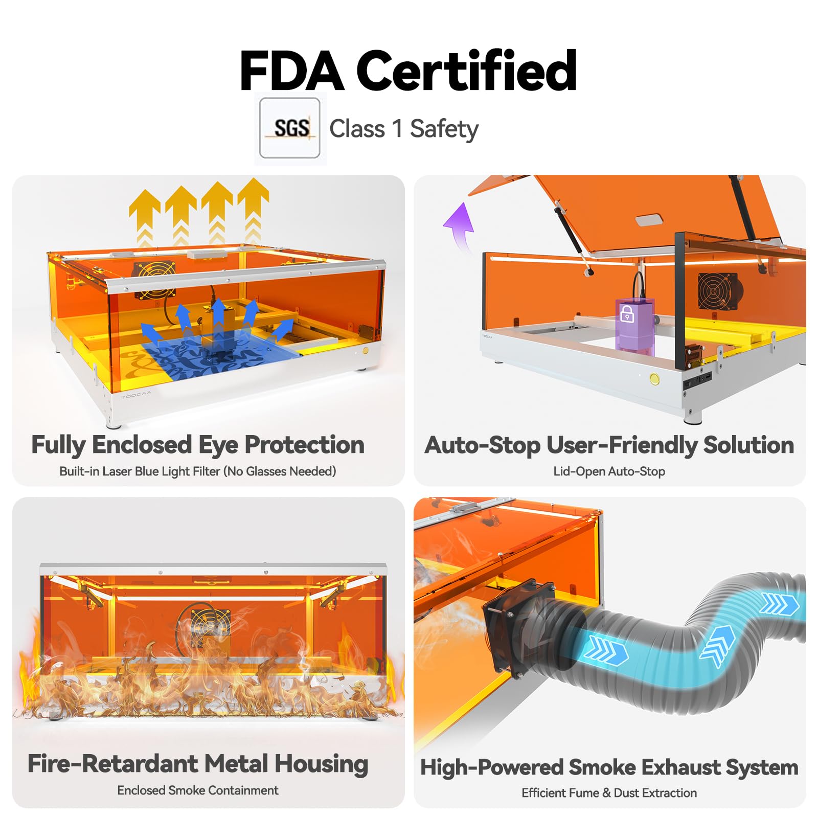- 【Class 1 Safety Certified Machine】This certified Class 1 cutting and engraving machine provides safety assurance for users at all levels, from beginners to professionals. Its smart enclosure integrates powerful features including smoke exhaust, laser blocking, auxiliary lighting, and safety interlock systems. The 360° fully-enclosed lid filters 99% of laser emissions, eliminating the need for additional enclosures or protective goggles. The laser module instantly deactivates when the lid is gently opened, ensuring continuous protection for both you and your artwork.