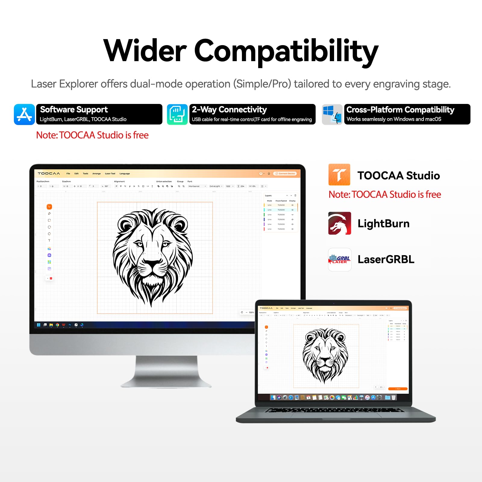 - 【Free Engraving Software】TOOCAA engraving machine provides free engraving software: TOOCAA Studio. It also supports popular software such as LightBurn and LaserGRBL. In addition, it also provides multiple connection methods and is compatible with multiple file formats, including JDXF,Picture. This engraving machine provides unparalleled flexibility.