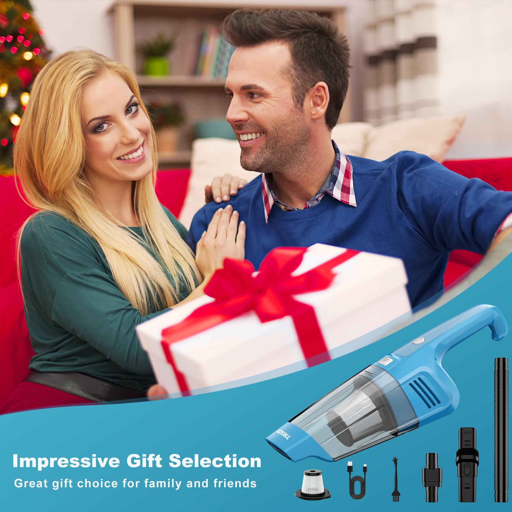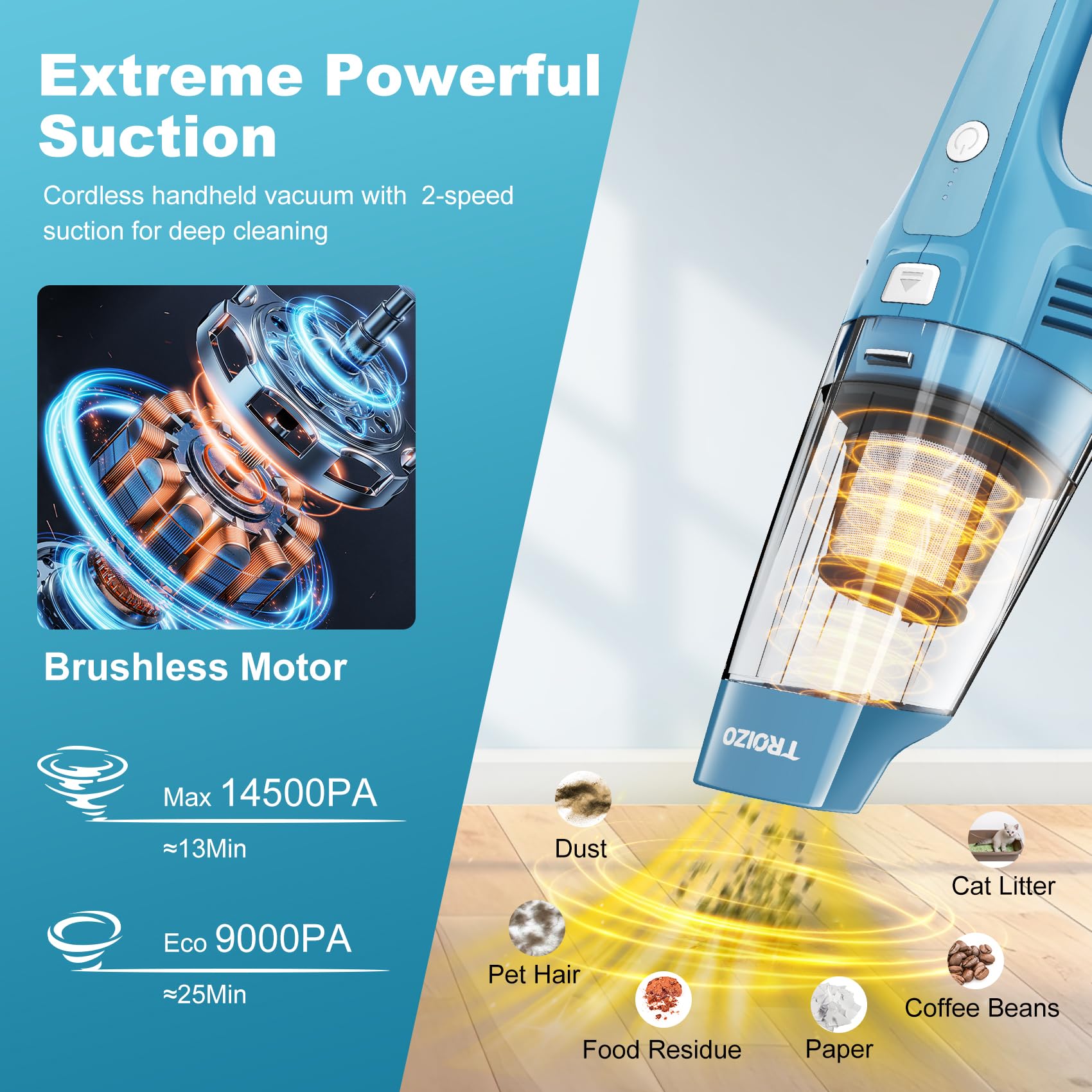 TROIZO Handheld Vacuum Cordless, 14500PA Powerful Suction Hand Held Vacuum Cleaner with Brushless Motor, Rechargeable and Portable Car Vacuum Cleaner with Multi Accessories for Home Office Car Pet