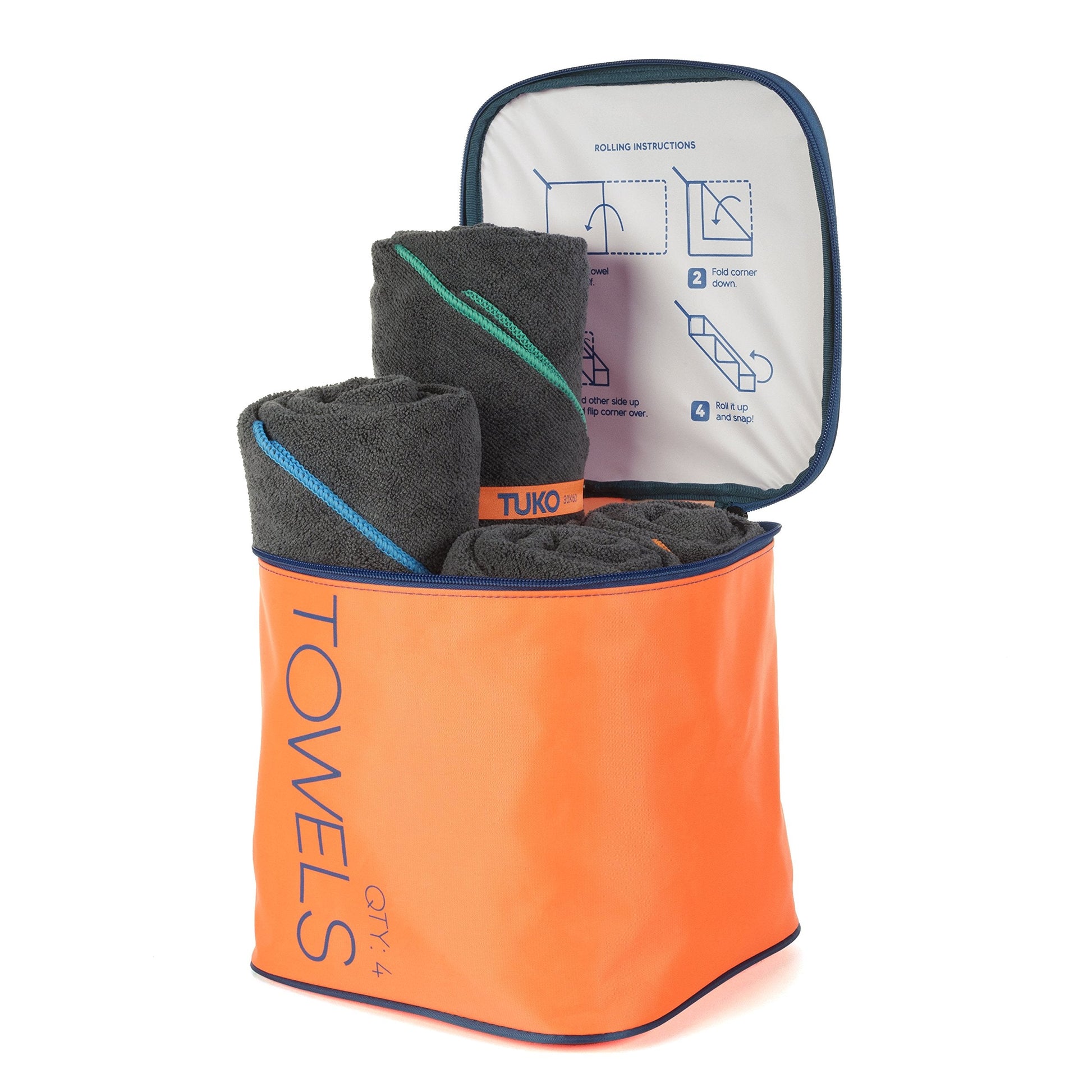 - WATER-RESISTANT CARRYING CASE - Keep sand and water off of your towels before you use them. All 4 towels fit conveniently into the included 8.5 inch x 8.5 inch x 8.75 inch carrying case.