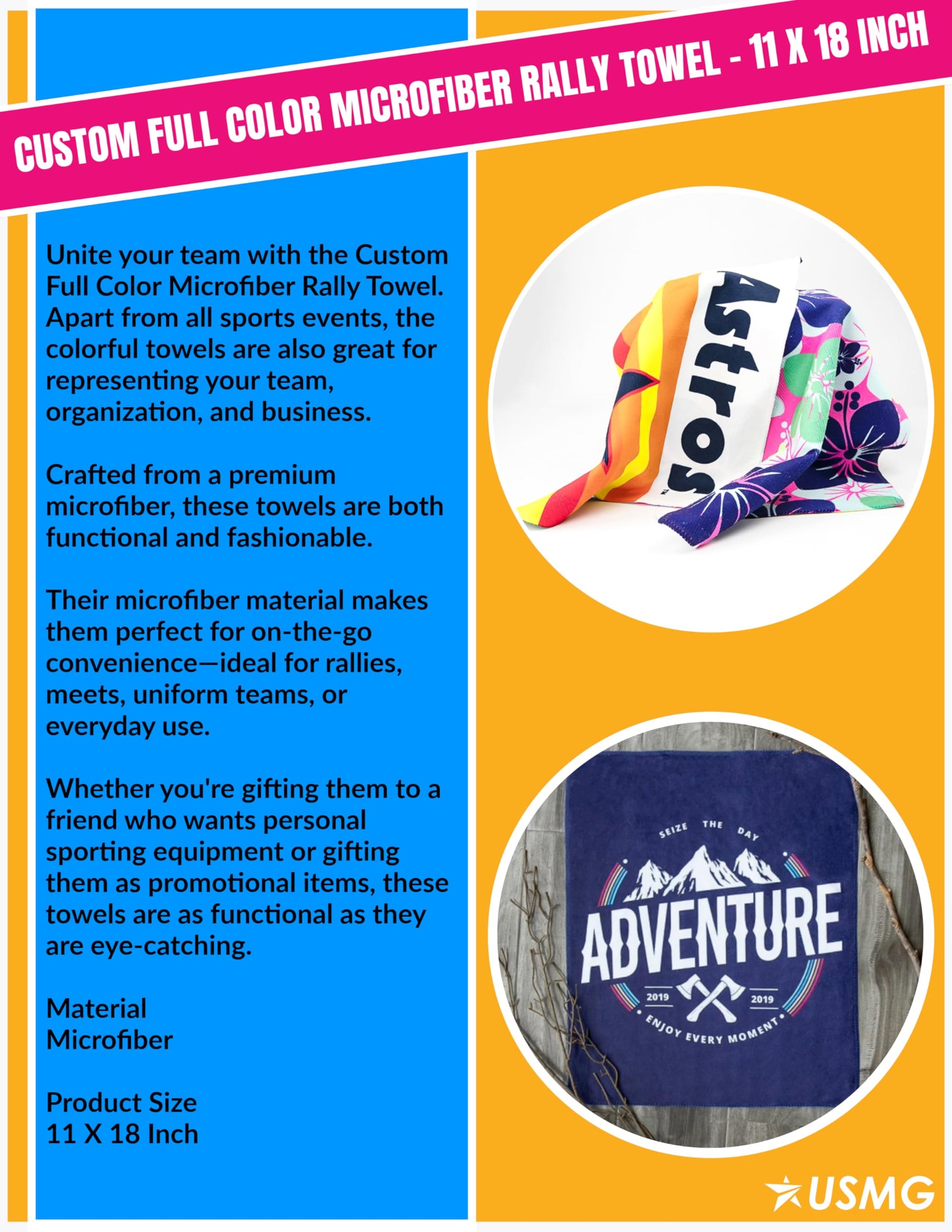 USMG Custom Full Color Microfiber Rally Towel 11x18 – Personalized Sports Spirit Towel for Events, Teams & Promotions (White, Qty 500)