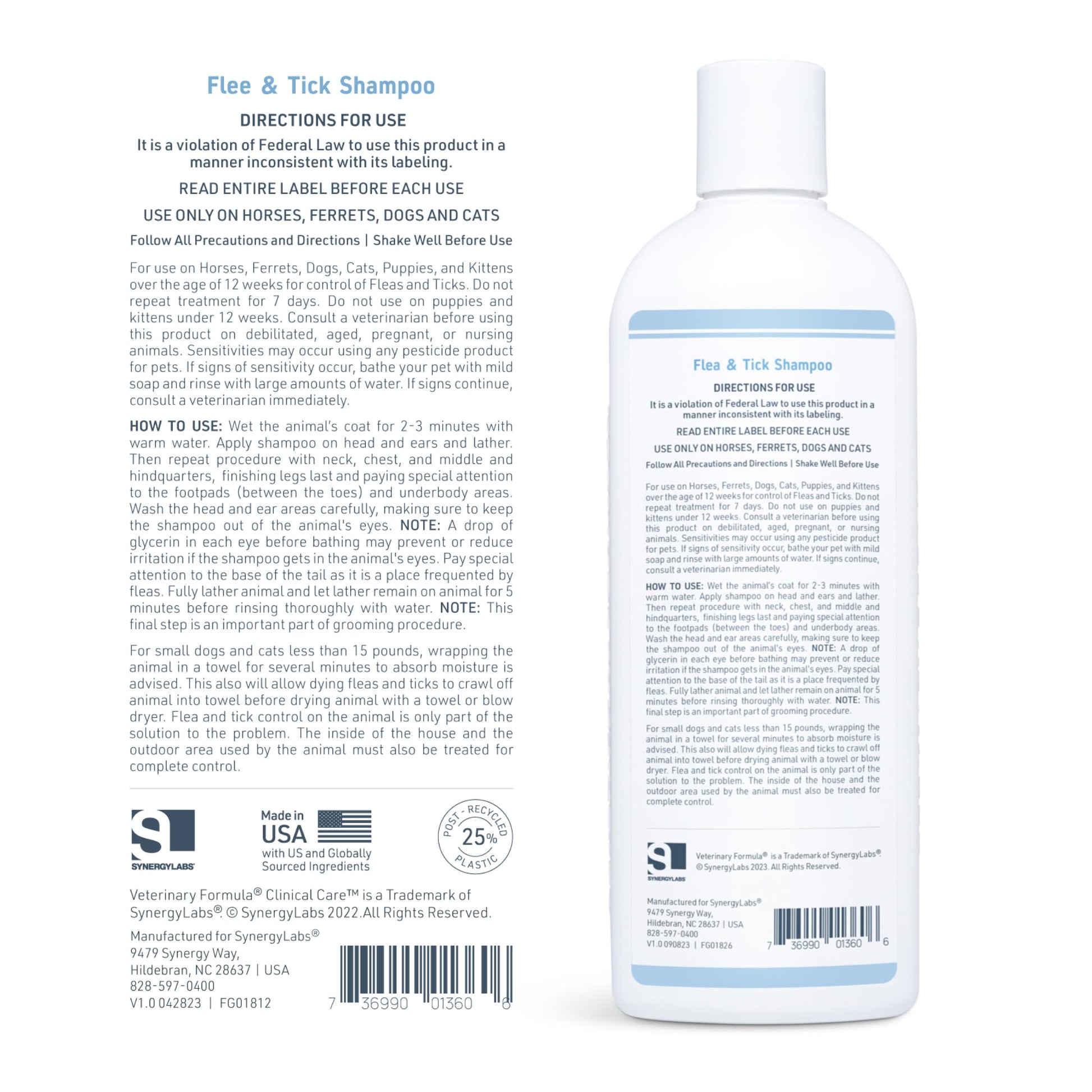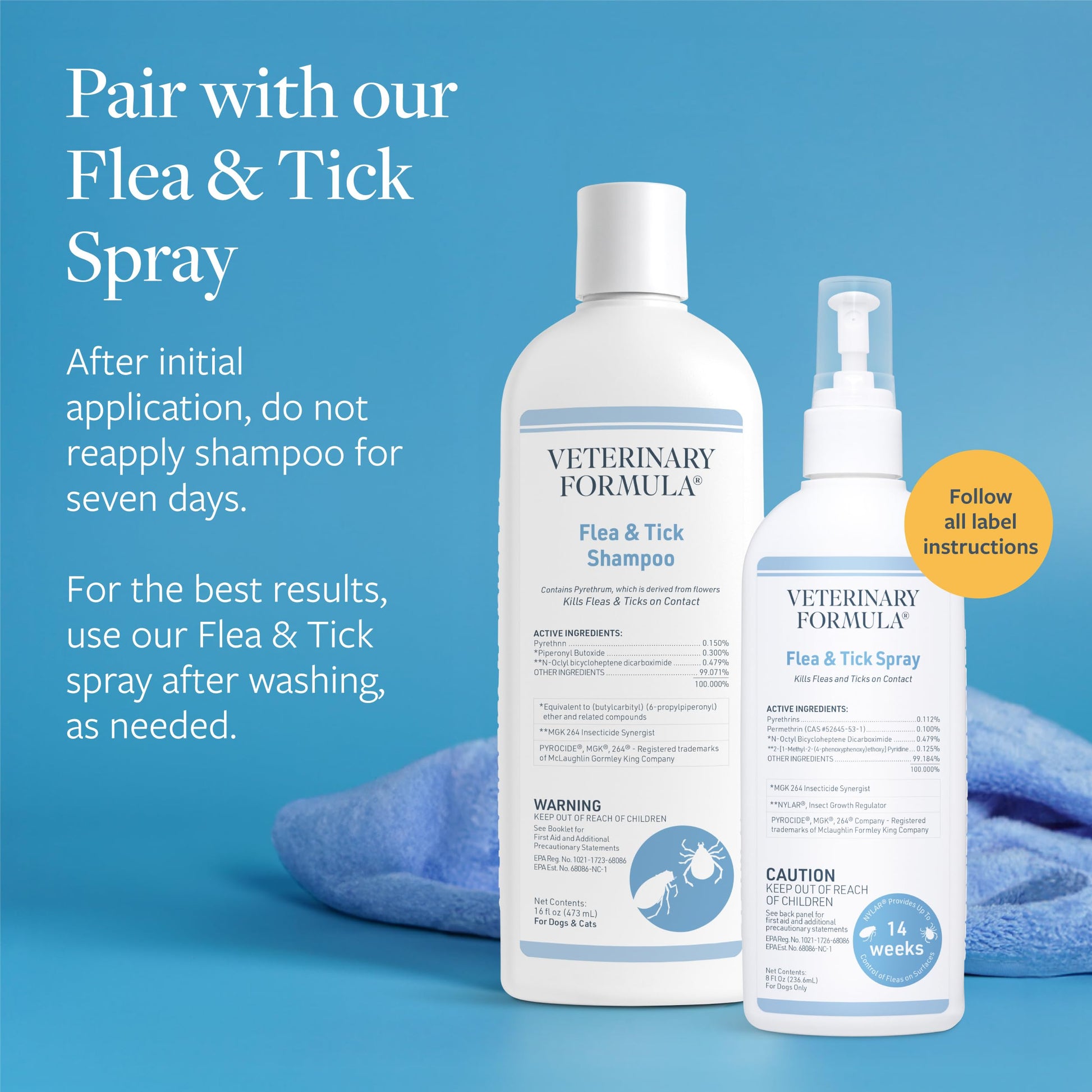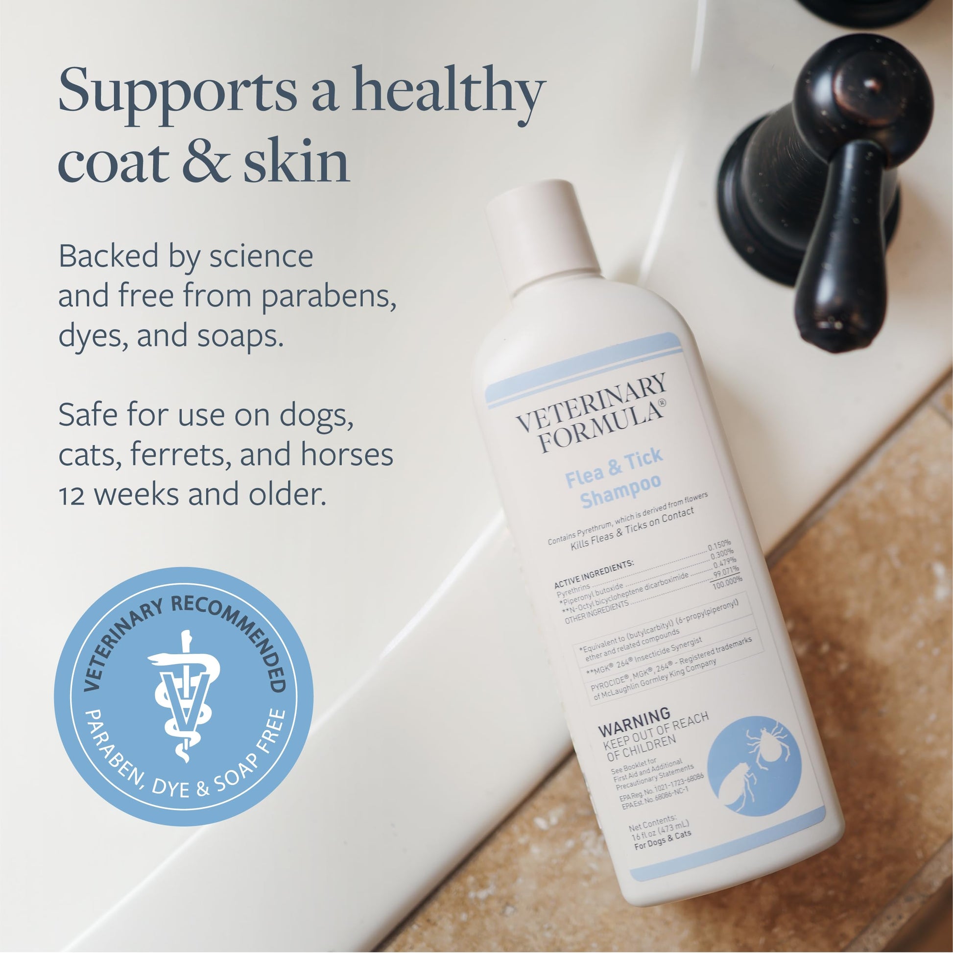 Details: Veterinary Formula Flea and Tick Shampoo is formulated with Pyrethrum, a natural insecticide, to immediately kill and control fleas and ticks. Made with Aloe Vera and Lanolin, it soothes irritations from flea and tick bites, while also gently cleansing and exfoliating your pet’s skin and coat. Pyrethrum, made from a flower, is the active ingredient in our 16 oz. bottle of Flea and Tick Dog and Cat Shampoo. Pet parents should look for droppings/flea dirt in the dog’s coat, allergic dermatitis, excessive scratching, licking or biting at skin, hair loss, tapeworms, and pale gums from flea and tick bites. This Flea and Tick Shampoo is paraben and soap-free. It contains no harsh soaps or damaging detergents, only naturally derived cleansers that are pH balanced for your pet’s skin. For best results, follow the instructions on the product packaging carefully. Wear rubber gloves when applying Flea and Tick Shampoo for dogs and cats. When shampooing your dog, avoid eyes. Use a cloth or sponge to shampoo around your dog’s eyes. Thoroughly wet the entire coat with warm water and then apply enough shampoo to make a lather and work thoroughly into the coat. For maximum control, allow the lather to remain in contact with the skin for five to ten minutes before rinsing. Do not reapply the product for 7 days. Flea and Tick shampoo is safe for dogs, cats, ferrets, and horses 12 weeks and older. We know that your dogs and cats are more than just pets - they are part of the family - so Veterinary Formula Clinical Care develops premium products that pet parents can actually afford. Your pet will be free of fleas and ticks, smell great and have a soft, shiny, and lustrous coat – making you both happy and able to focus on more important things like treats, games, and snuggles.