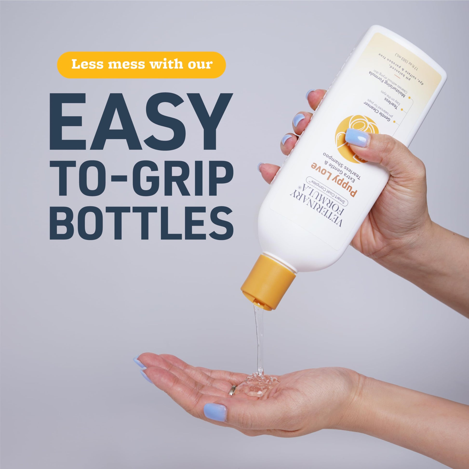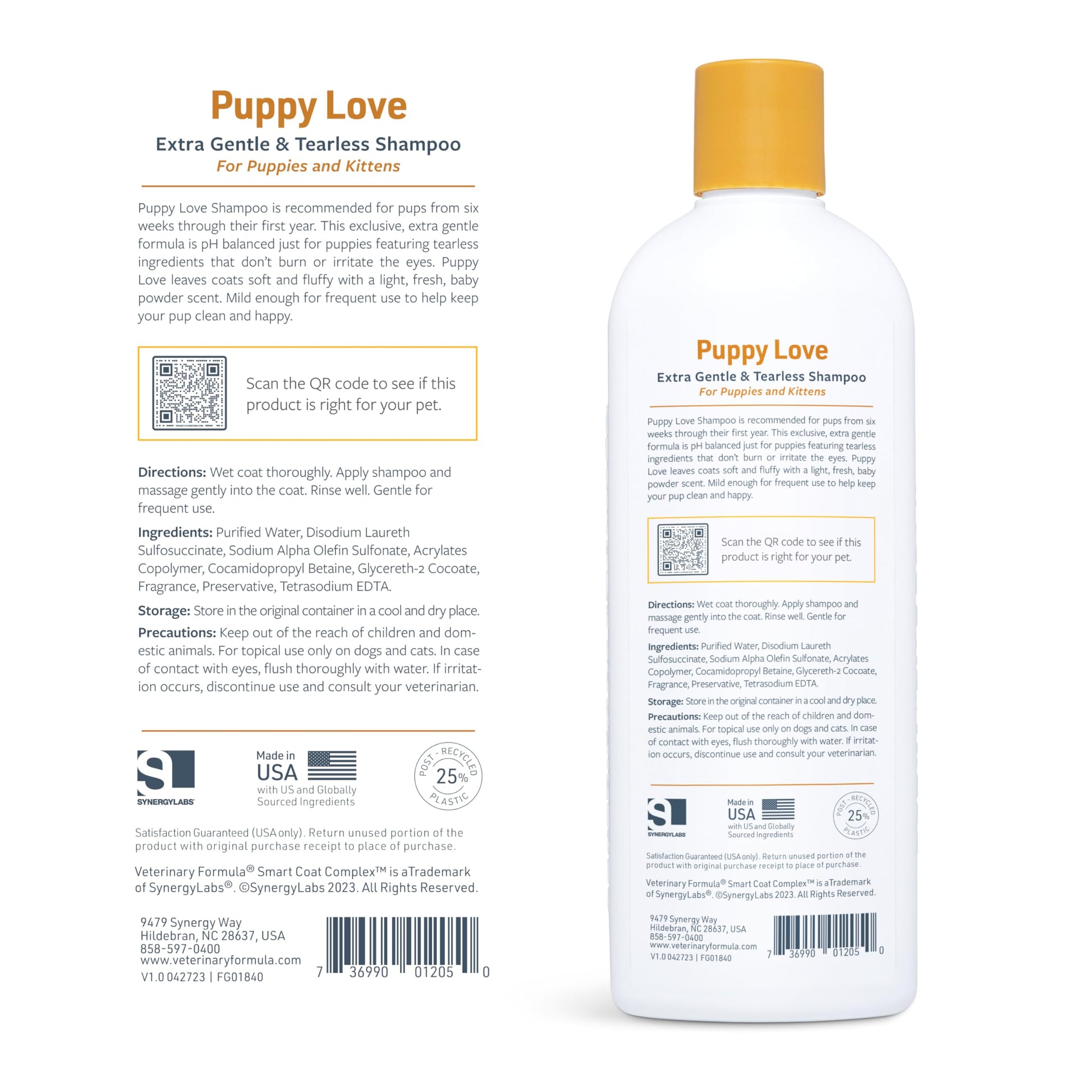- EXTRA GENTLE – Recommended by vets for puppies first year, Veterinary Formula Solutions Puppy Love Extra Gentle Tearless Shampoo is sulfate and DEA-free. This puppy shampoo cleanses without drying out delicate skin and leaves coat soft and fluffy