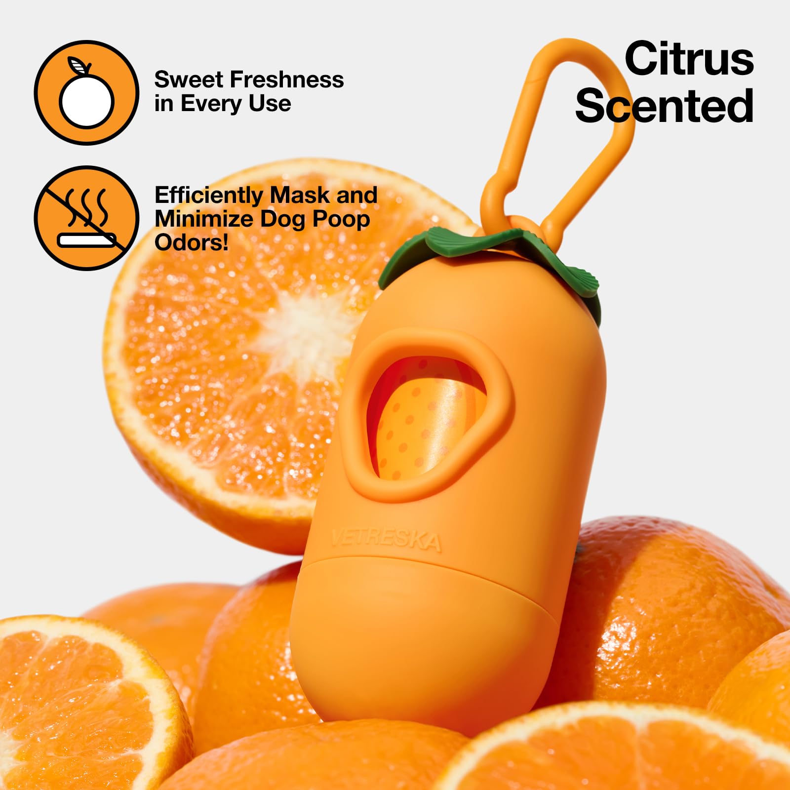 VETRESKA Dog Poop Bag Dispenser with Citrus Scented Waste Bags, Leak Proof, Extra Thick and Large Pet Poop Bags for Walking Dog and Cats Litter, 1 Count Holder and 105 Bags, Orange