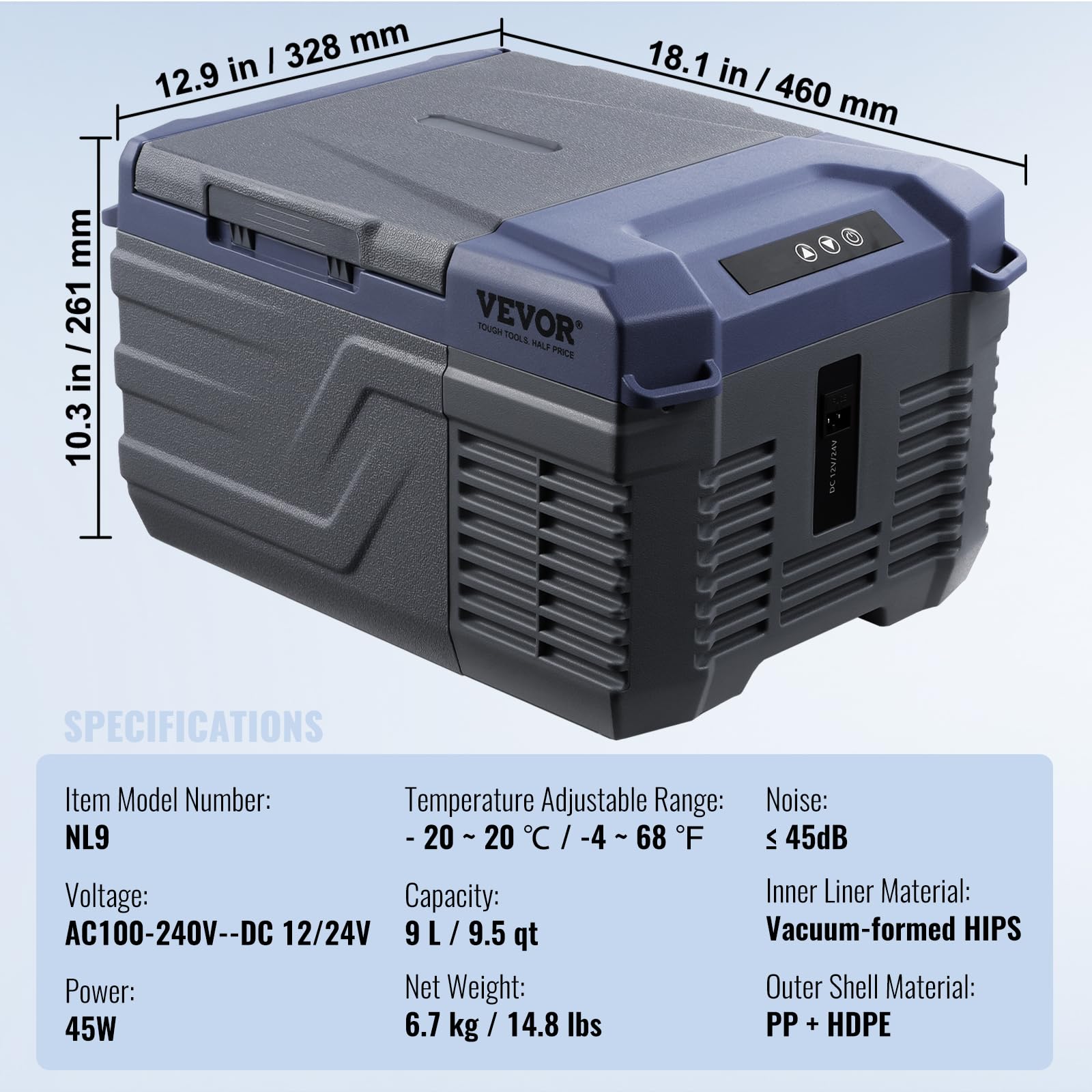 VEVOR Car Refrigerator, 12 Volt Car Refrigerator Fridge, 9 L Single Zone Portable Freezer, -4℉-68℉ Adjustable Range, 12/24V DC and 100-240V AC Compressor Cooler for Outdoor, Camping, RV