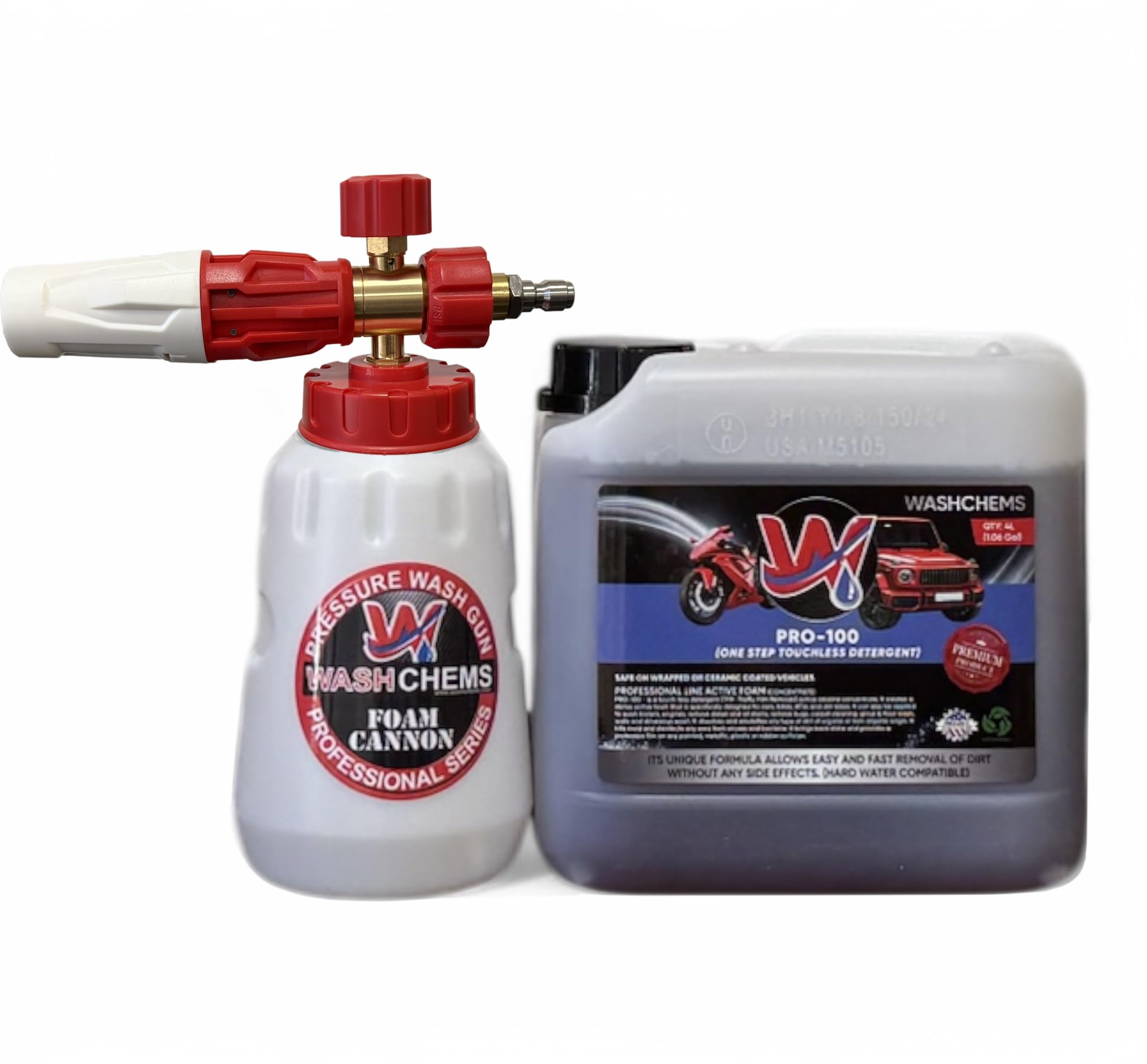 Details: Heavy-Duty Touchless Car Wash Detergent Soap includes Professional Foam Cannon. Commercial Grade Car Wash Detergent Soap with Heavy Degreaser Containing Active Alkaline Concentrate and TFR (Traffic Film Remover) including Foam Cannon. PRO-100 creates a dense active foam that was specifically designed for Cars, Trucks, Motorcycles or any large size equipment. It can also be used to wash engines. Brushless Touch-free car wash! It dissolves and emulsifies any type of dirt of organic or non-organic origin. It makes surfaces shine and provides a protective film on any painted. metallic, plastic or rubber surfaces. It's unique formula allows total and fast removal of dirt without any side effects on your vehicle parts. How to use the soap with Wash Chems Foam Cannon :Use the following dilution rate 1 to 3 up to 1/5. Our Foam Cannon works with both electrical and gas pressure washers. Spray the Foam on any surface - wait 1-2 minutes then use pressure washer to rinse off and obtain a clean surface. FOAM CANNON SPECS: - Large Mouth HDPE 32 OZ Container - 800-3,500 PSI operating pressure range; 1.4-5.3 gallon/minute pressure washer compatibility - Hi-Flow Breather Valve mixes the perfect amount of air with the high pressure water and car wash soap to create thick clinging foam - Adjustable nozzle sprays foam from 0 Degree soapy jet to a gentle extra-wide 90 Degree fan - Sprays thick car wash active foam over any vehicle, pre-saturate dirt and debris to reduce chances of swirls and scratches. No brushing required when used with Wash Chems Active Foam Products. - Adjustable spray pattern (horizontal or vertical) with a twist of the wrist. - Stainless steel quick connector - 1.1mm orifice (helps to increase pressure a obtain think foam during output) Wash cars more efficiently, only one gallon of Wash Chems is equivalent to using ten gallons of a competing brand. Depending on the dilution ratio used, one gallon of Wash Chems PRO-50 can wash up to 25 trucks!
