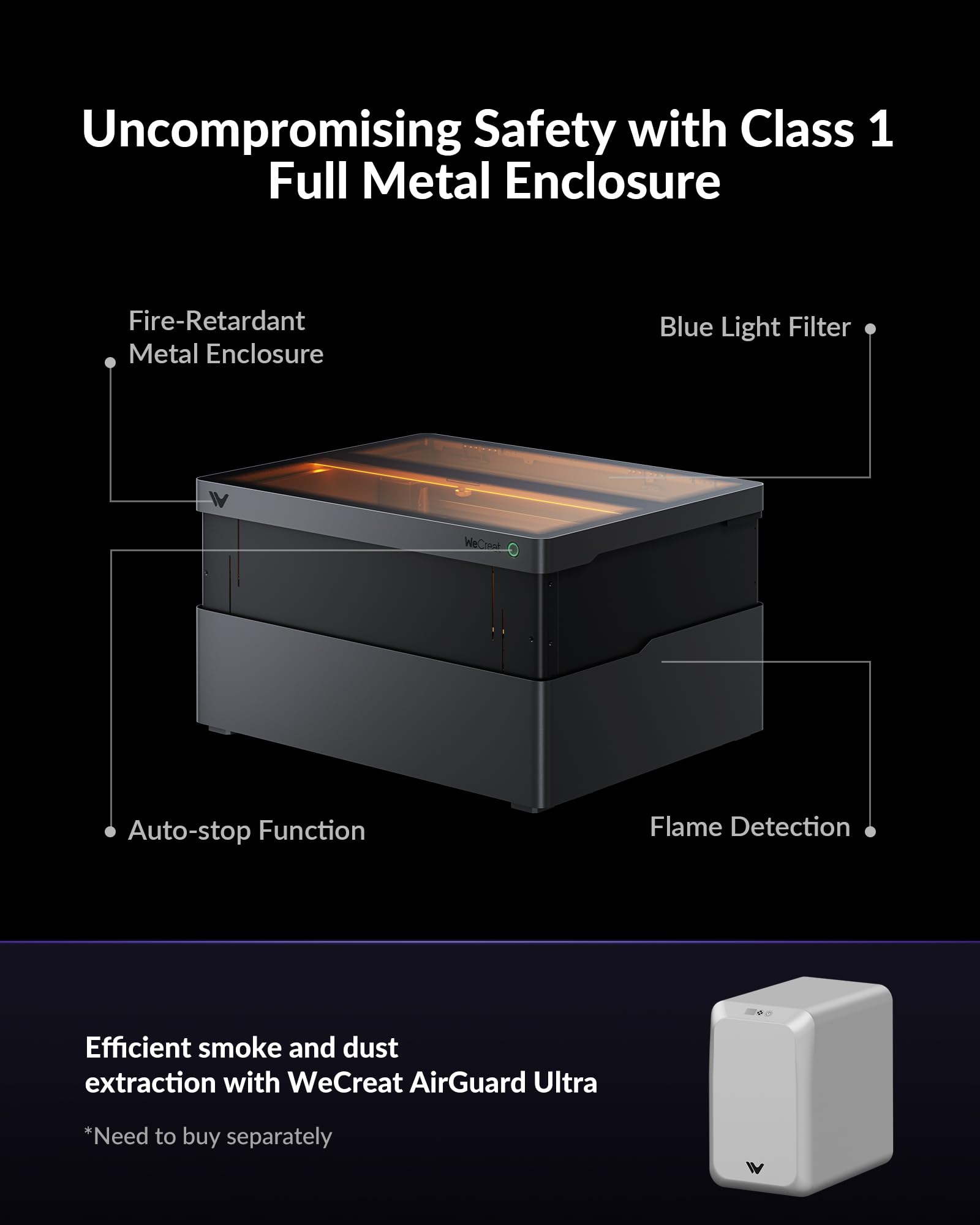 - Class 1 Certified, Safety First: with fully metal enclosed structure, and a eyes-protective cover that automatically filters harmful blue light, the laser cutter machine auto stops once the lid is opened, this ensures the safety of children and pets, making it ideal for schools, workshops, and home use.