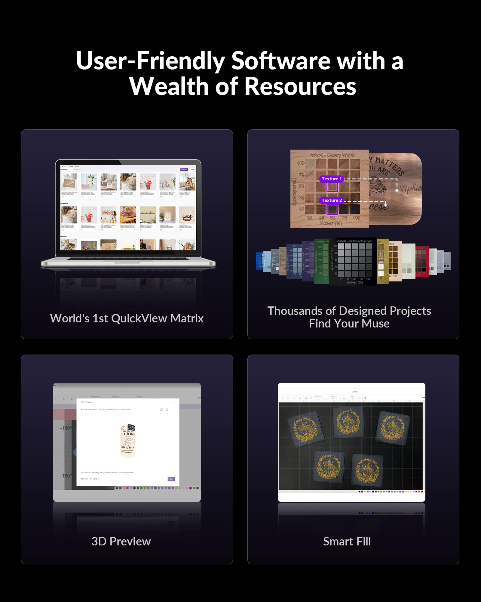 - User-Friendly Software with a Wealth of Resources: World’s 1st QuickView Matrix for one-click material settings, simplifying workflows. The easiest 3D preview for full-wrapped cylinders at one go and Smart Fill for efficient batch engraving. Access thousands of design templates to maximize creativity.
