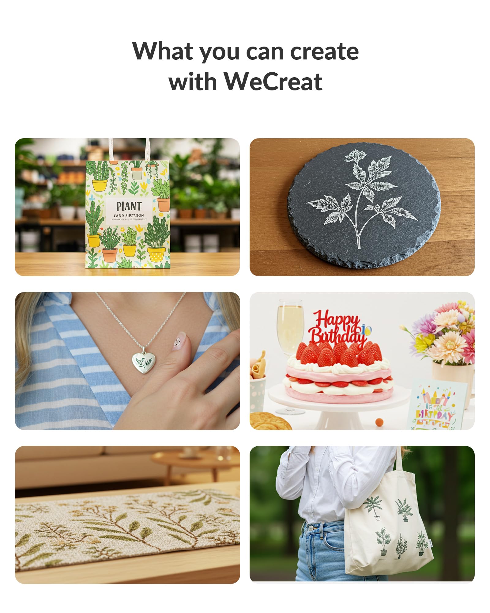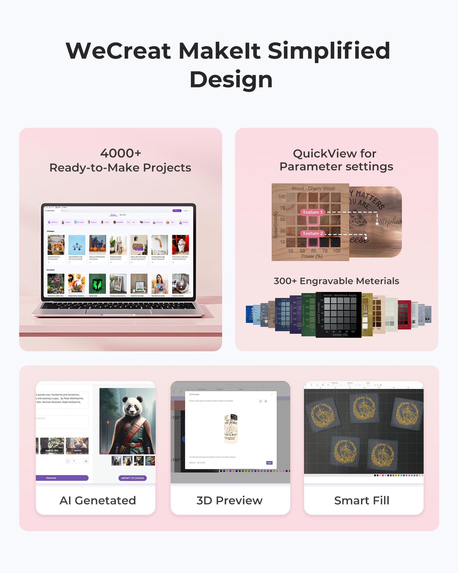 - [WeCreat MakeIt's New Look & Extensive Library]—Experience the best of both worlds – full compatibility with LightBurn plus an updated WeCreat MakeIt library packed with over 2000+ design projects, 500+ typefaces, thousands of SVG images, and weekly new additions. From Valentine's Day to weddings, Halloween to Christmas, the only limit is your imagination. Create custom gifts, earrings, art pieces, or even architectural designs – the Vista is your ticket to endless creativity.