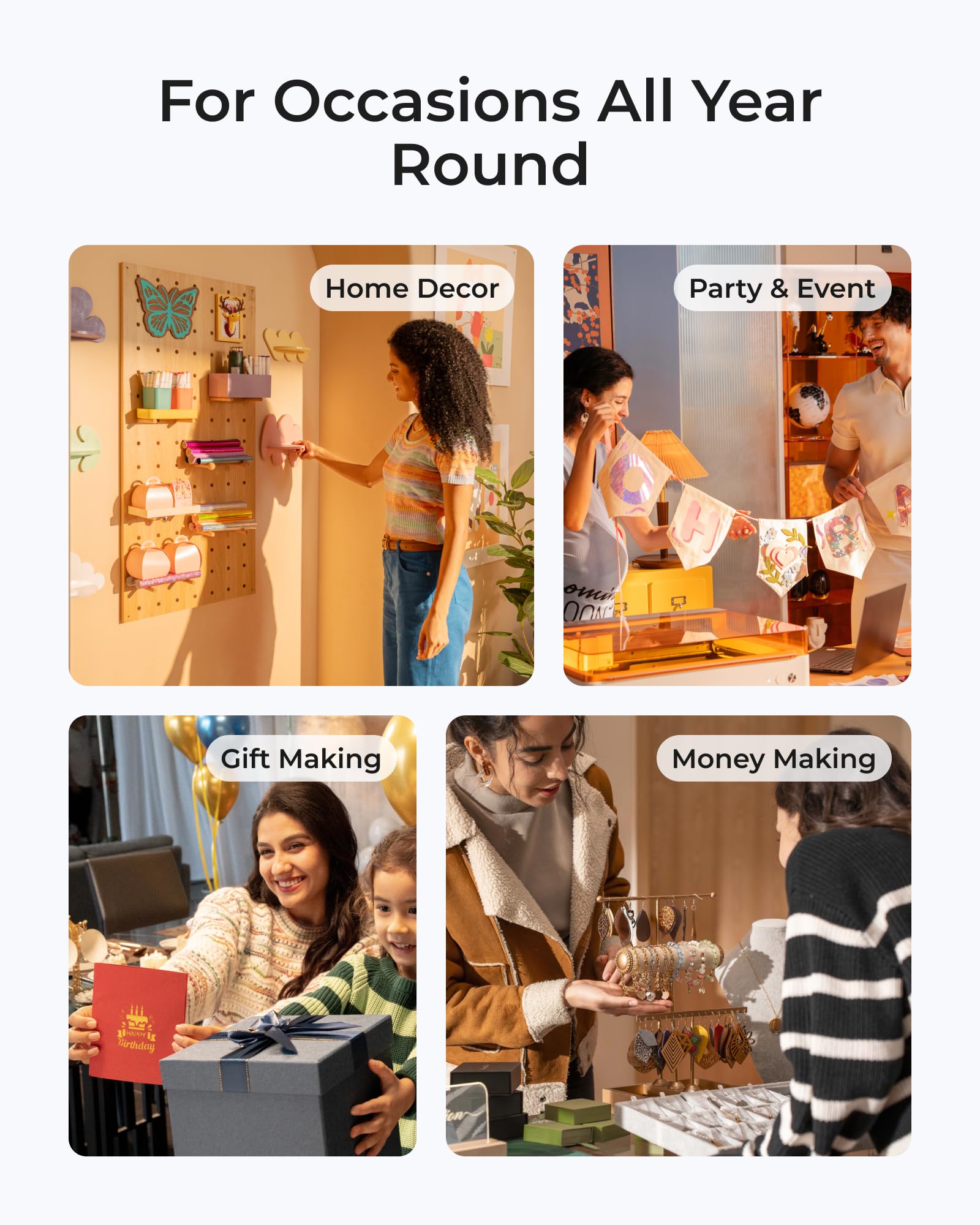 - Bring Your Ideas to Life: Whether you're crafting personalized gifts, designing home decor, or preparing for life's milestones, M1 Ultra is your creative companion for every occasion. From personalized door signs and custom greeting cards to unique clothing and holiday decor or Mother's Day gifts, M1 Ultra laser engraver machine is here to help customize every item in your life.
