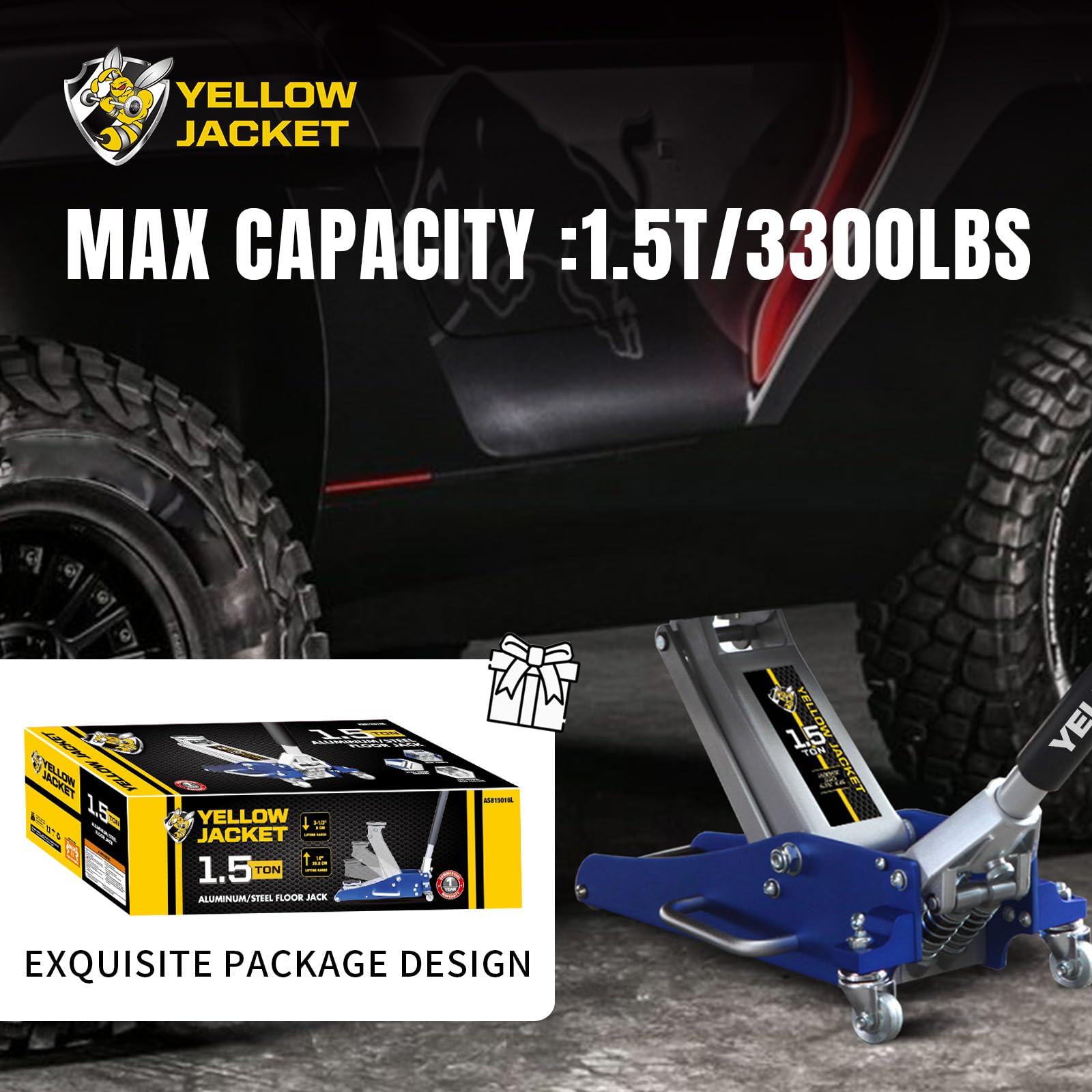 YELLOW JACKET Floor Jack 1.5 Ton Hydraulic Low Profile Aluminum and Steel Car Jack Lightweight Service Jack with Quick Lift Dual Pump, 3300 lbs Capacity