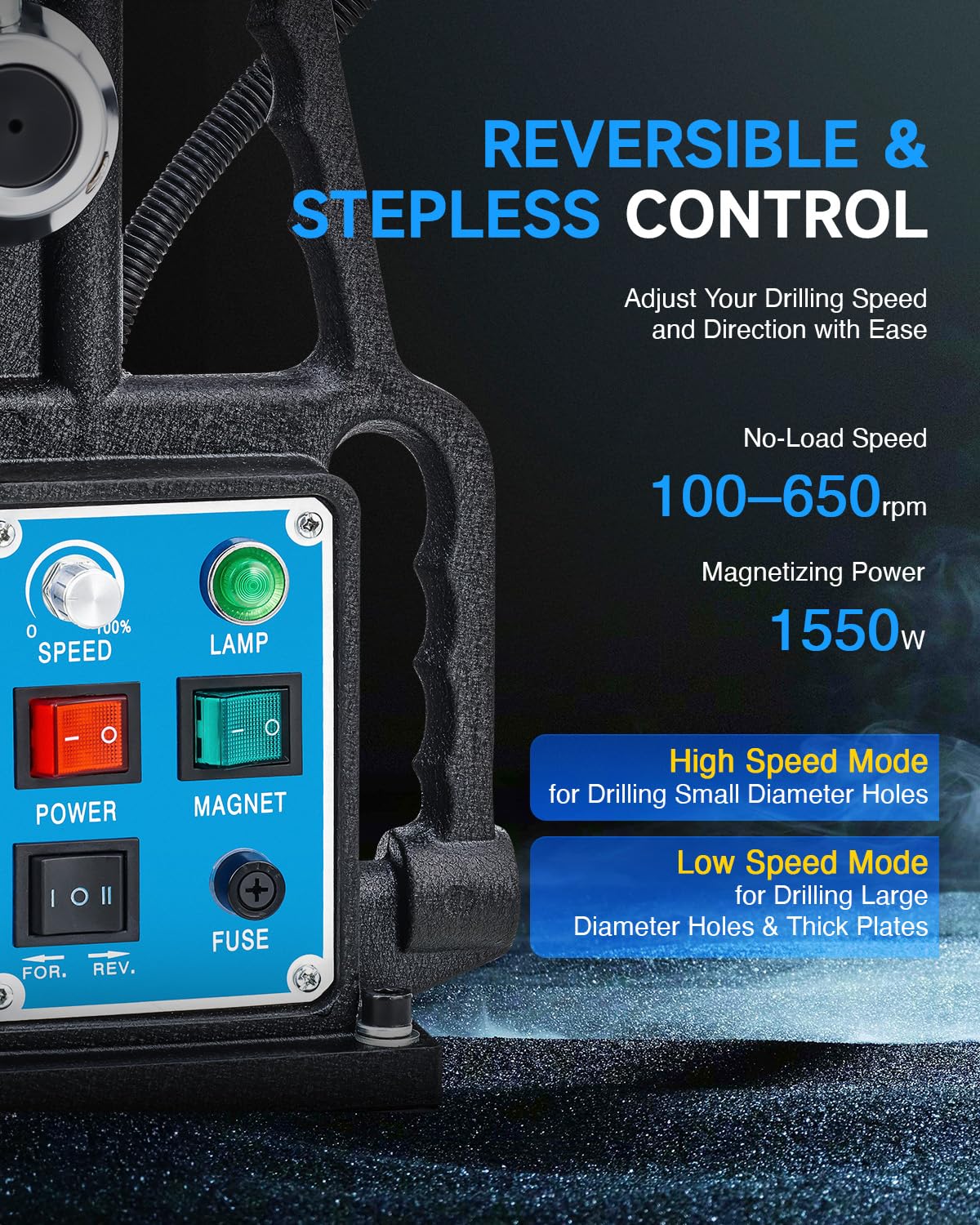 - Superior Performance: The ZELCAN magnetic drill press boasts a powerful 1950W copper motor working power 1550W, drilling at a rapid 650 rpm and handling holes up to 2' in depth and 2' in diameter. It includes 11 drill bits for you to create holes in most common sizes.