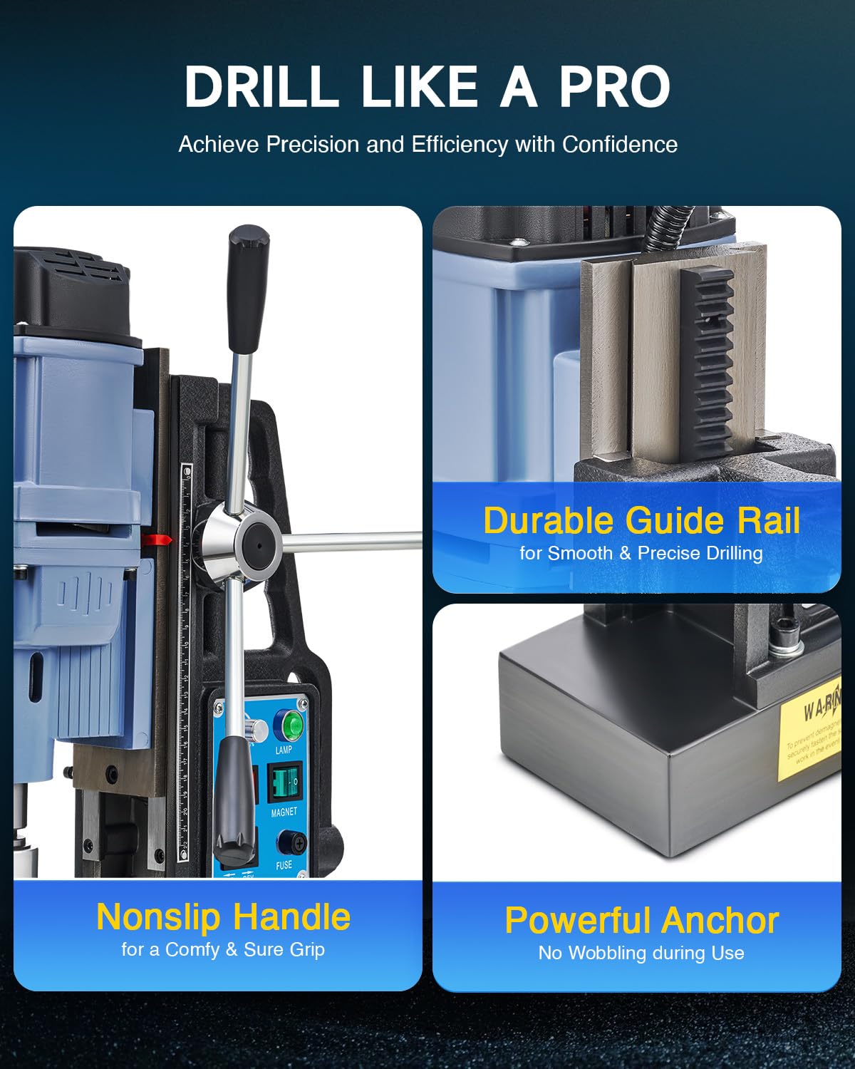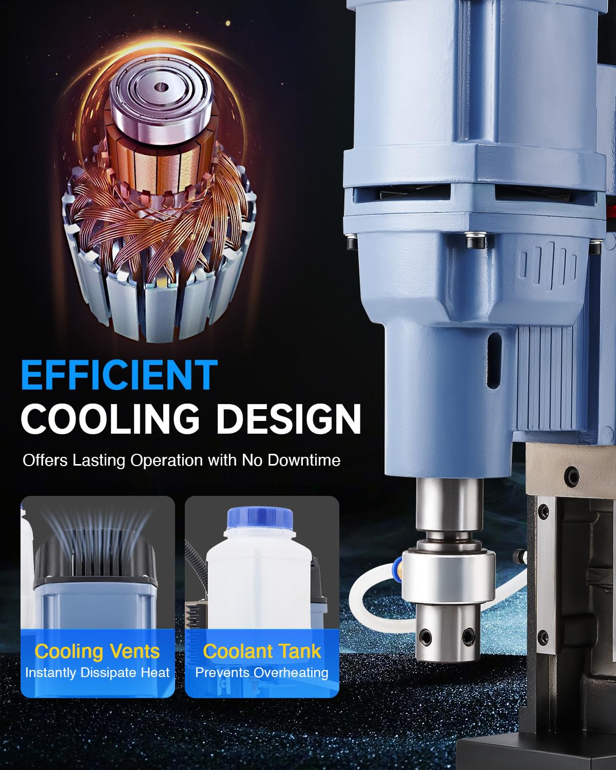 - Efficient Cooling System: Thanks to its generous 16.9 fl. oz. coolant tank, this magnetic drill press efficiently manages heat, preserving precise drilling and prolonging the machine's life.