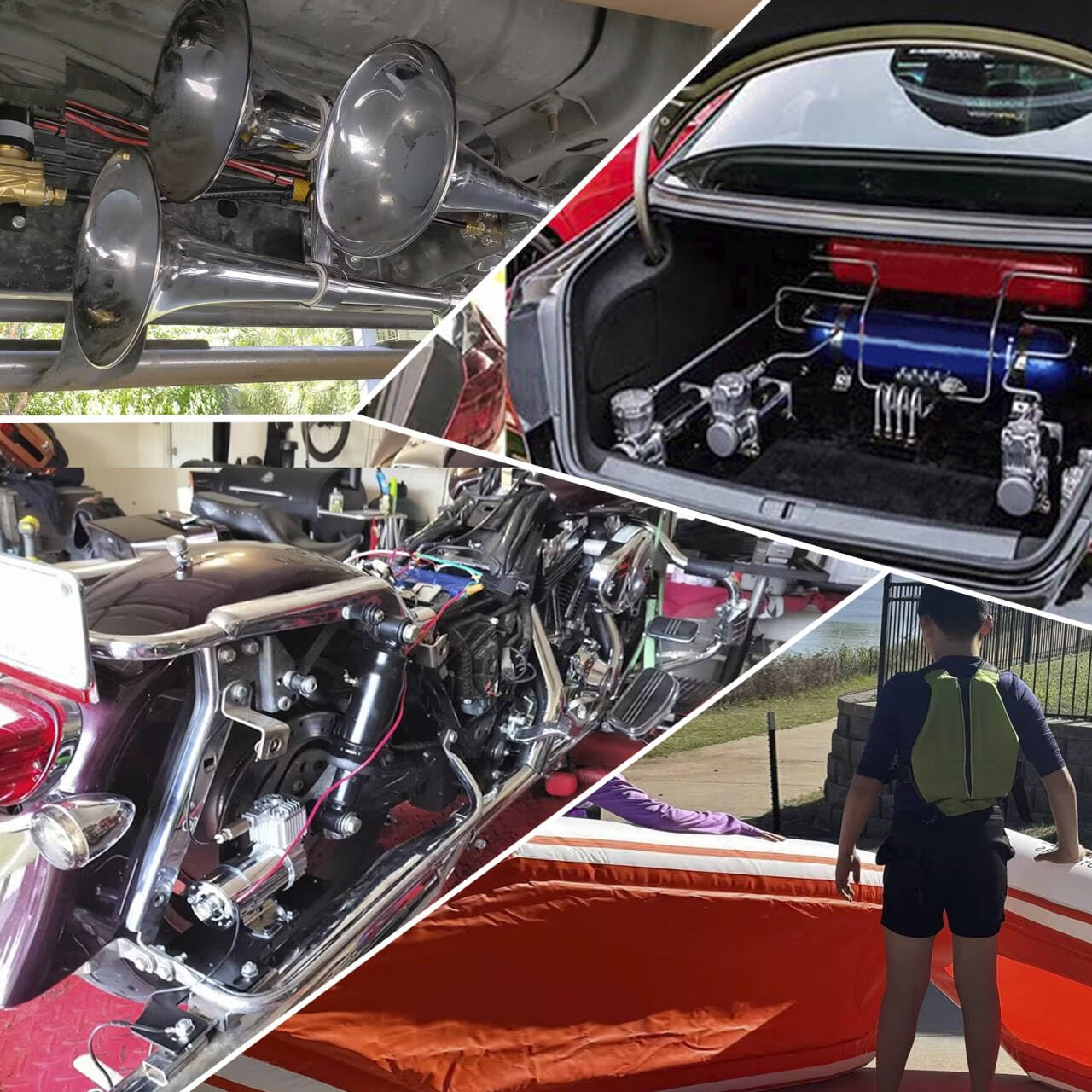 - 150 PSI COMPRESSOR: An efficient 12V compressor with an air flow rate of 1.9CFM and 1/4 NPT hose that will rapidly fill up your air tank for applications such as train horns, air suspension, tire inflation and air tools.